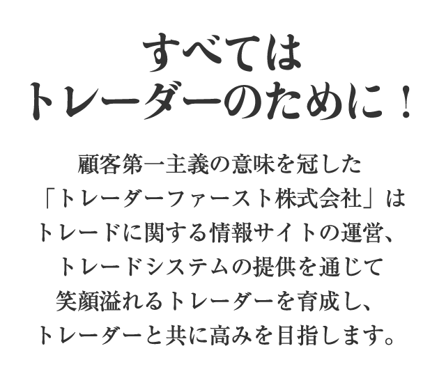 最後になりましたが、「トレーダーファースト」という社名に込めた想いを常に意識し、顧客第一主義をとことん貫き、たくさんのトレーダーと共に高みを目指し尽力して参りますので、今後とも末永くご愛顧賜りますよう、どうぞよろしくお願い申し上げます。