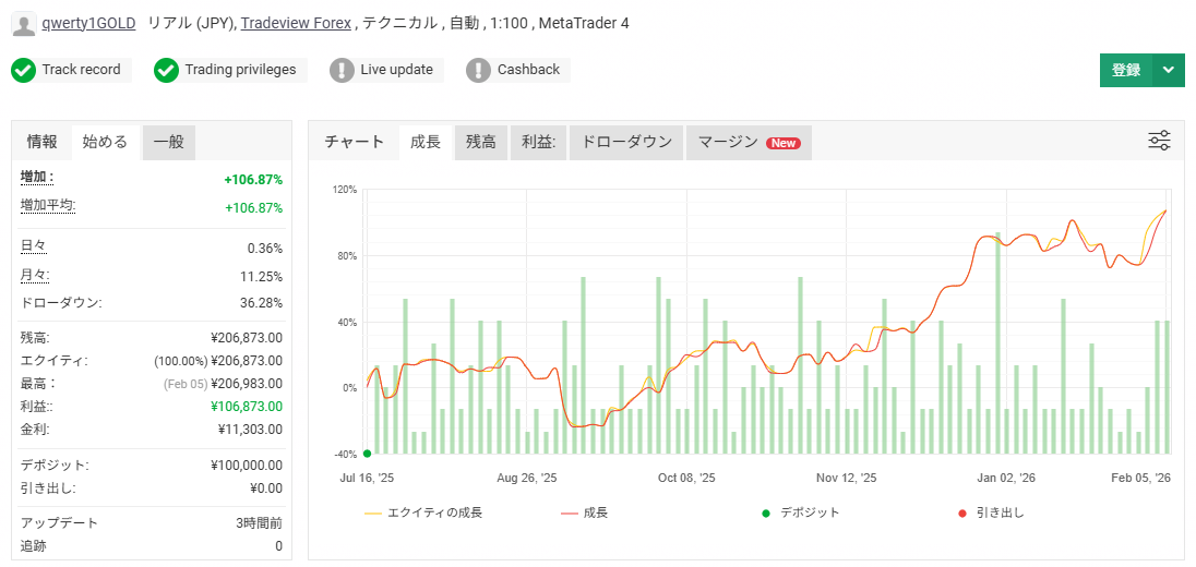 また、少ない資金で開始する顧客を想定して、別の取引口座で2025年7月16日から2026年2月5日までの約6か月半、資金10万円で運用したところ、+106.87%という結果になりました。