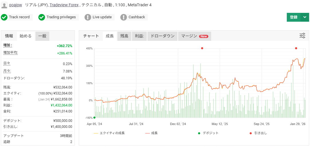 2024年4月5日から2026年2月5日までの22カ月間、実際の取引口座で運用したところ、+362.72%という結果になりました。