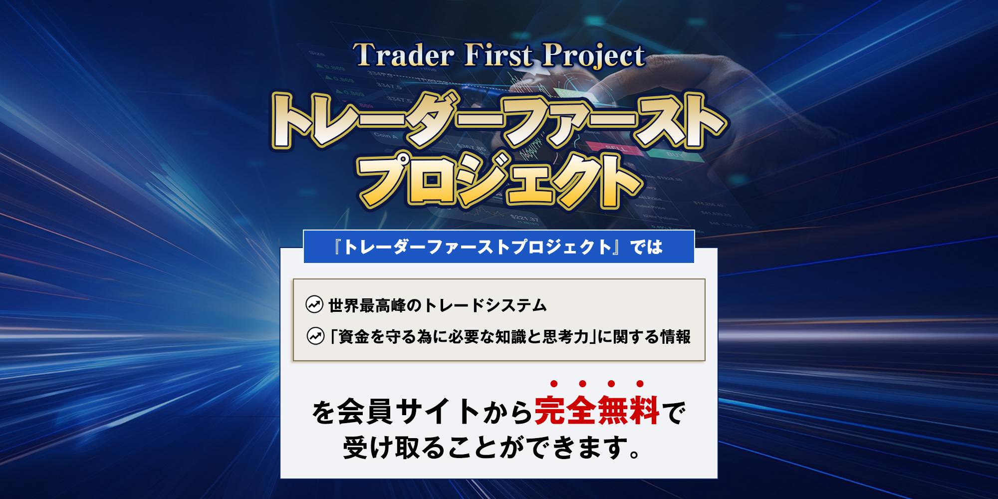 さて、ここからは『トレーダーファーストプロジェクト』について詳しく知りたいという方の為に、ご提供するトレードシステムの特徴や会員サイトで公開する情報についてご説明させていただきます。